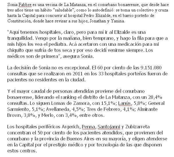 En la nota, publicada hace exactamente dos años, el Ministro Lemus dice «atendemos a todos sin discriminar» cuando jamás debió comentar lo incomentable, es decir, el no discriminar no es una conducta para hacerse propaganda, porque se transforma en hipocresía. El autor, Pablo Tomino, adopta una actitud de pluma liviana frente a las autoridades porteñas, que se atajan de todo posible sesgo de que se los señale con el dedo por remarcar algo que termina significando un «te doy salud, a vos, que no sos de aquí, porque soy bueno, aunque sé que la ley me obliga»